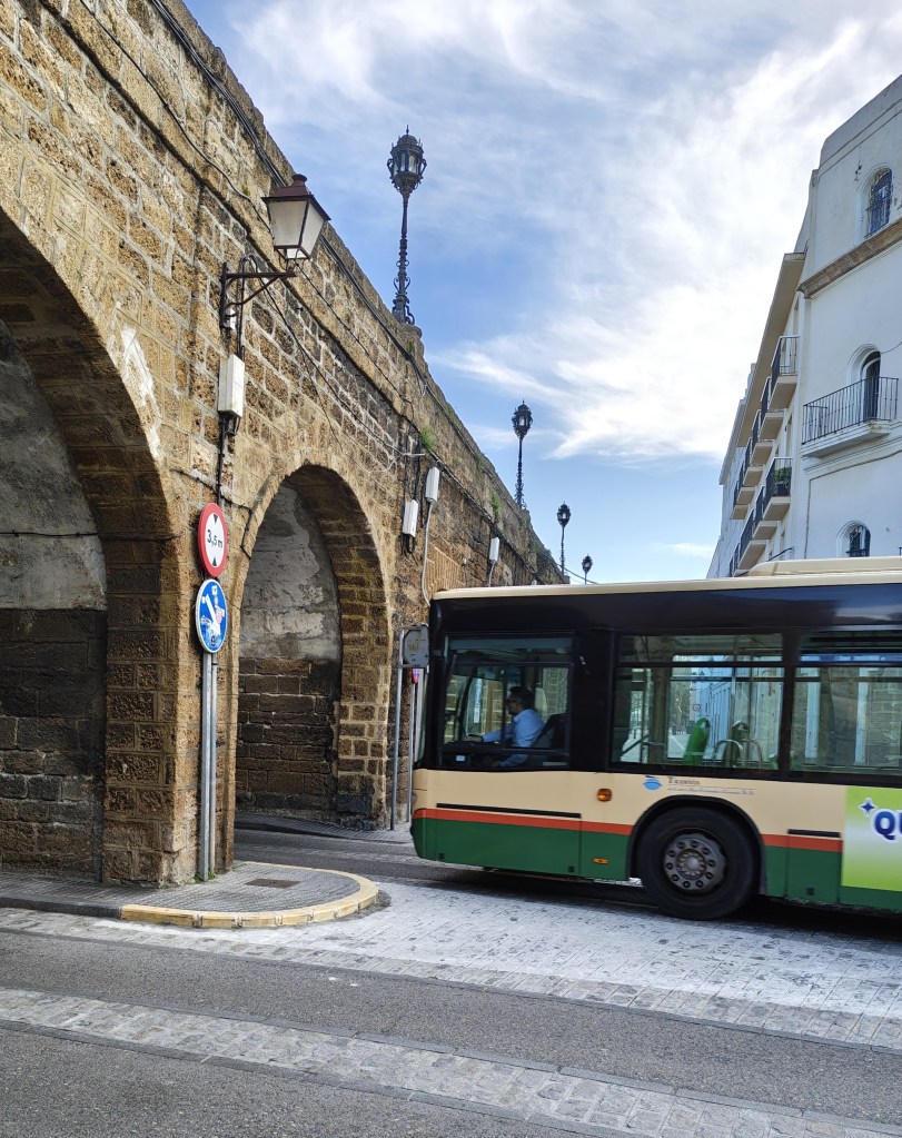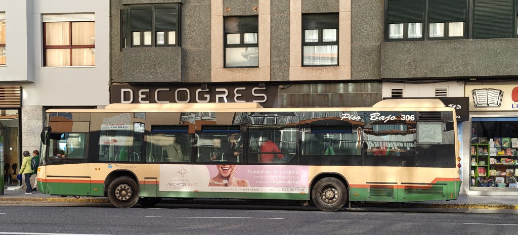 Wsiadamy w najważniejszą linię autobusową w Kadyksie. Numero uno czyli „1”. Jeździ ona przez cały miasto wzdłuż i jest najbardziej oblegana .Trzeba przyznać że jeździ co kilka minut dosłownie, czasem jadą dwa autobusy razem i la gitarra.