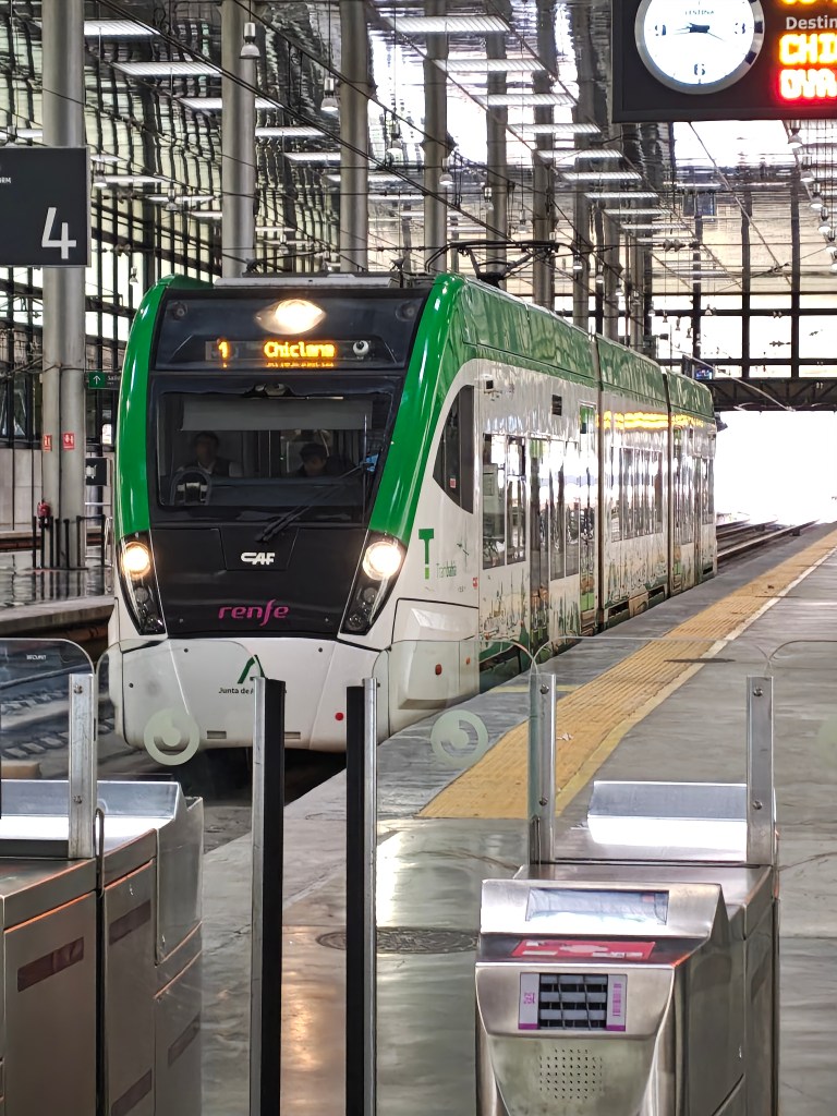 Trambahia na dworcu kolejowym w Cadiz. Dla mnie to raczej kolej podmiejska, ale Hiszpanie uparli się że to potomek dawnych tramwajów, które zlikwidowano w latach 50-tych ubiegłego wieku.