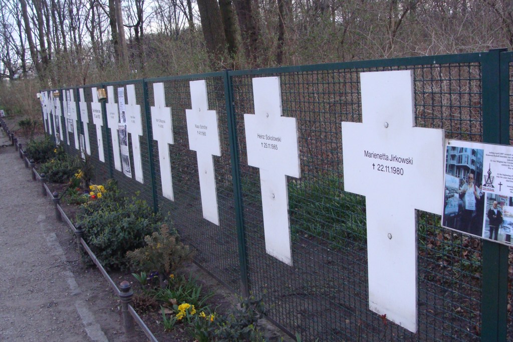Krzyże pamiątkowe. Hołd dla ludzi , którzy próbę przekroczenia Muru Berlińskiego przypłacili życiem.