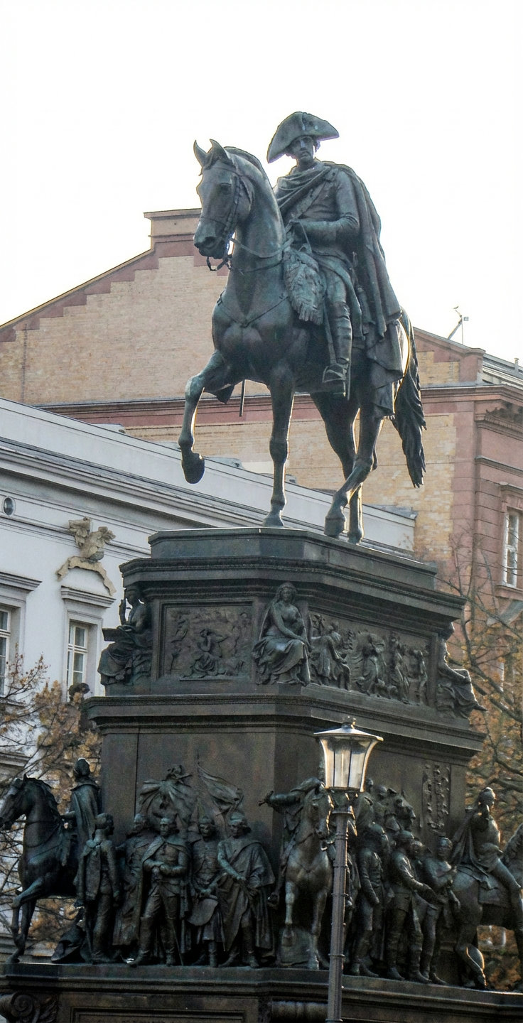 Pomnik Fryderyka II Wielkiego króla Prus. Główny architekt pierwszego rozbioru Rzeczypospolitej razem z carycą Katarzyną II w 1772 roku. Mówiąc poprawnie politycznie nie był to przyjaciel Polaków.